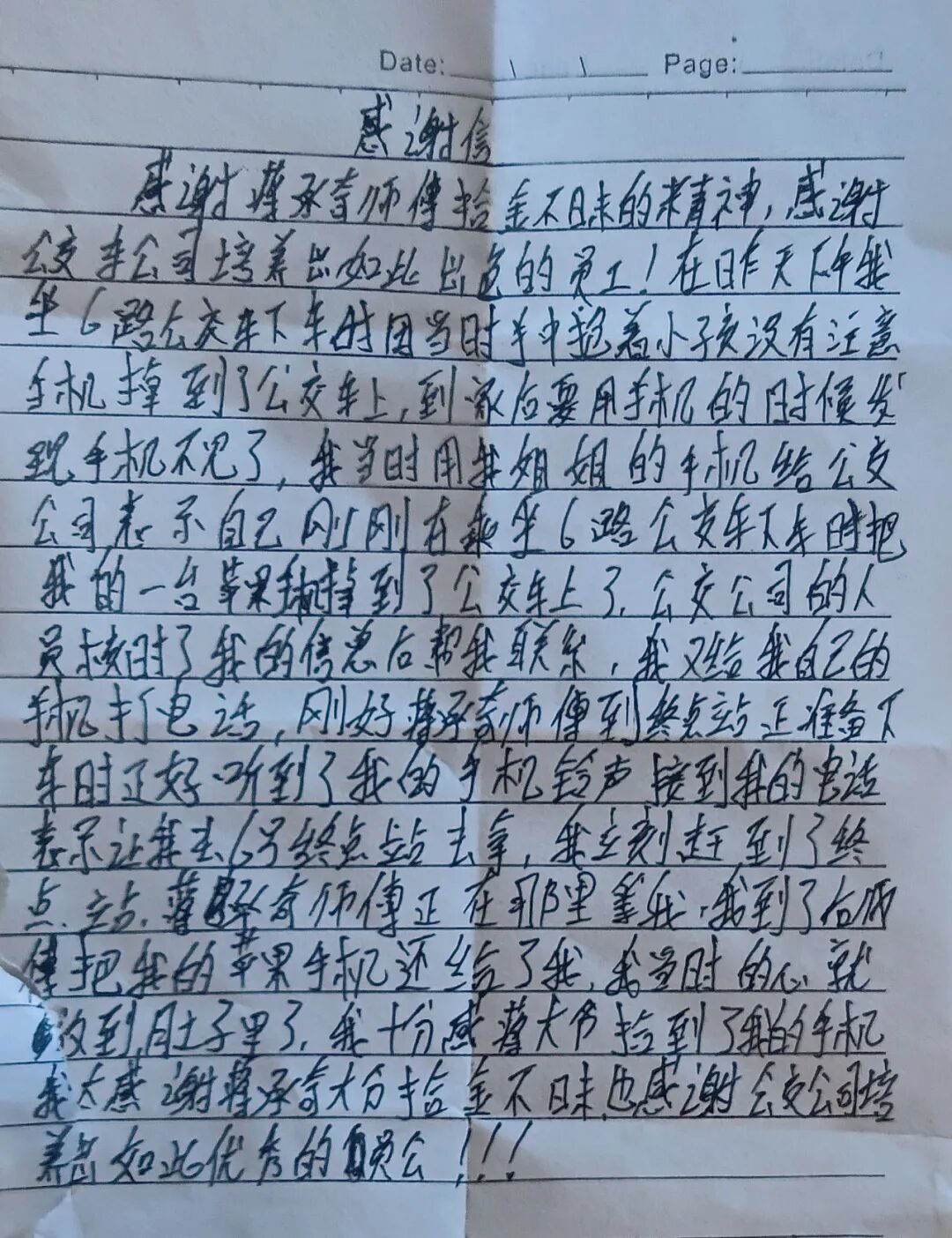 为了感谢蒋师傅拾金不昧的精神,感谢公交公司培养出如此优秀的员工,睿女士亲自送来了这封感谢信。